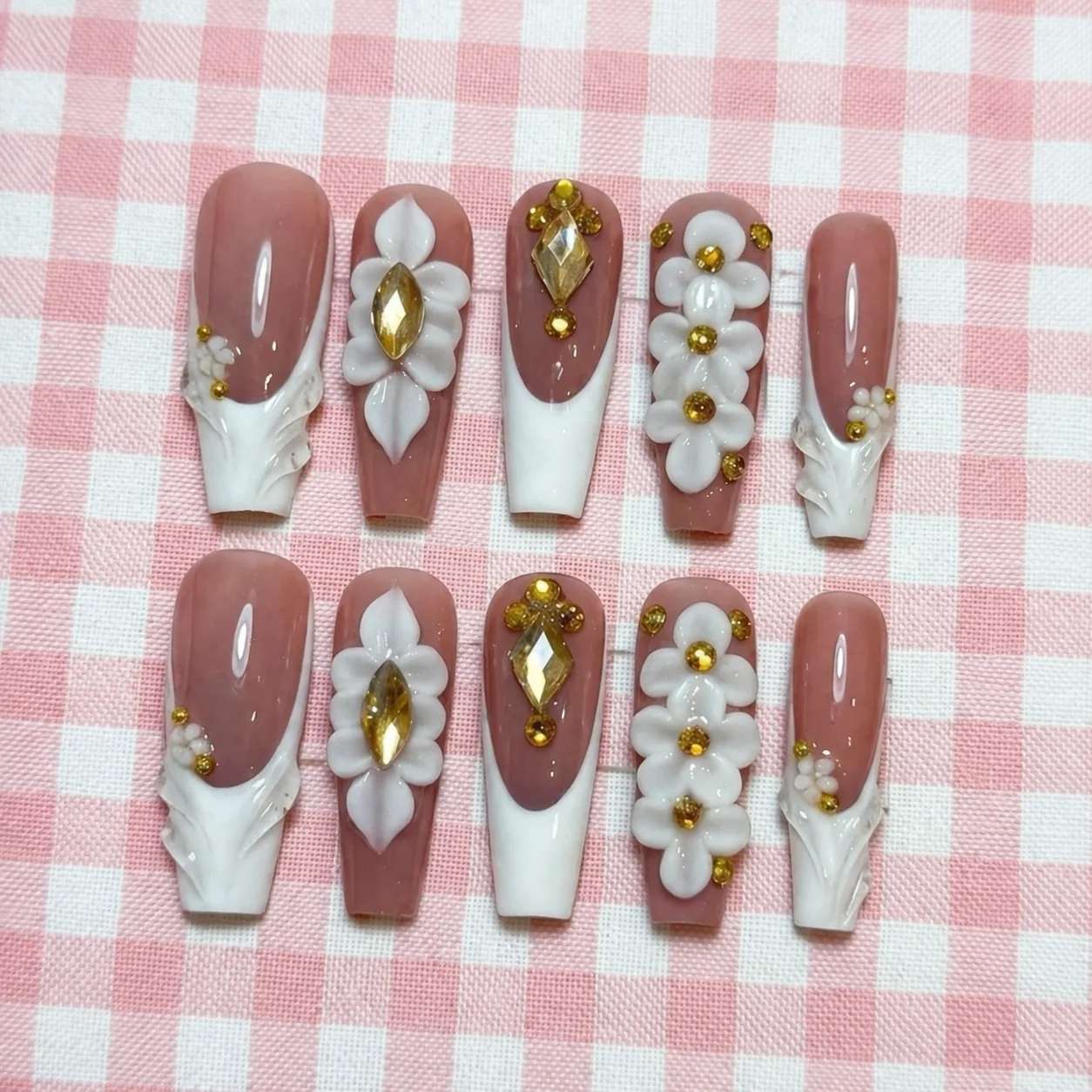 This elegant nude nail set features a refined blend of soft neutral tones, 3D floral accents, and gold embellishments for a luxurious, timeless look. Designed with sculpted white flowers, delicate textures, and gemstone-inspired details, each nail delivers a sophisticated, salon-quality finish. The balanced nude and white color palette enhances versatility, making it perfect for weddings, special occasions, or everyday elegance. Handcrafted with precision, these press-on nails offer durability, comfort, and a premium aesthetic that elevates any outfit with subtle glamour.