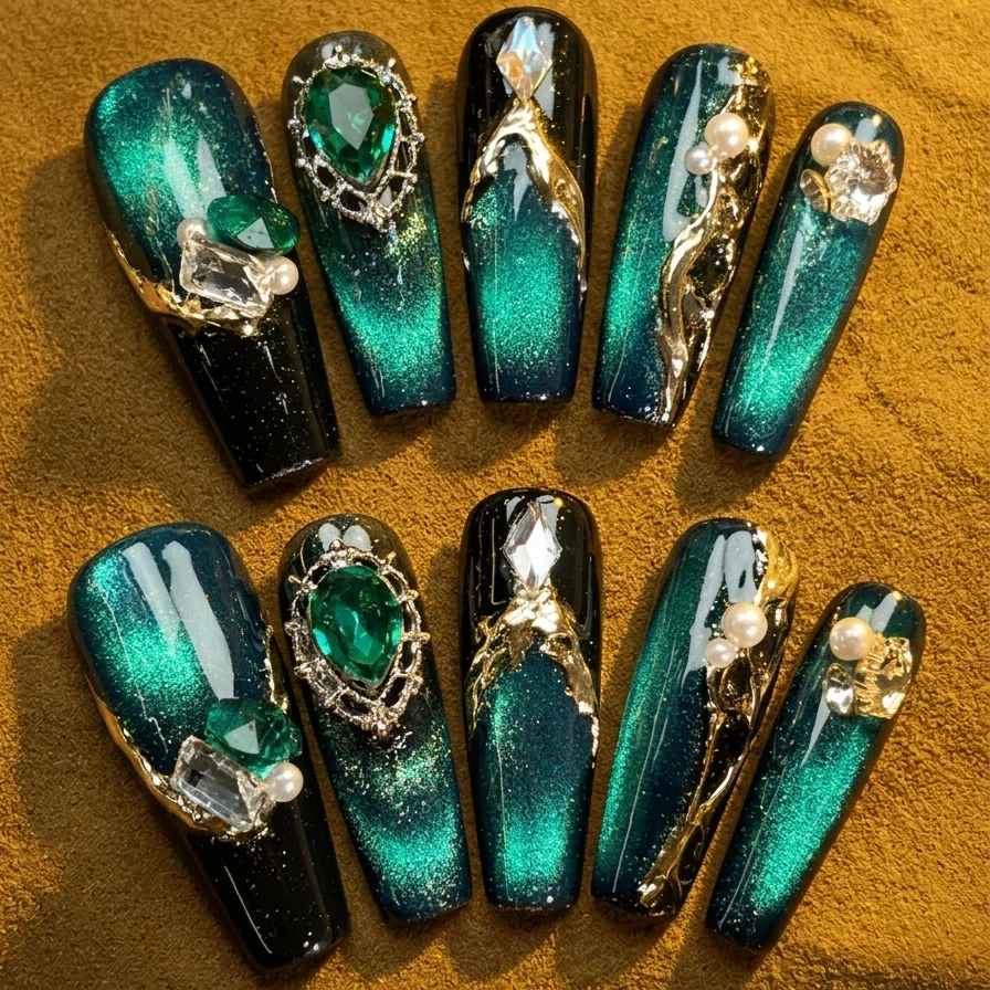 This luxurious nail art set features a captivating emerald green chrome finish that shifts beautifully under light, creating a deep, metallic gradient effect against a glossy black base. Each nail is adorned with opulent embellishments, including faceted gemstone crystals, pearl accents, and intricate gold detailing that flows organically across the surface. The rich green tones evoke a sense of sophistication and elegance, while the reflective chrome texture adds a modern, high-fashion edge. Set against a warm sand-textured background, the contrast enhances the brilliance of the metallic hues and jewel-like decorations. Ideal for statement looks, luxury press-on nail collections, or editorial beauty content, this design embodies bold glamour and premium craftsmanship.