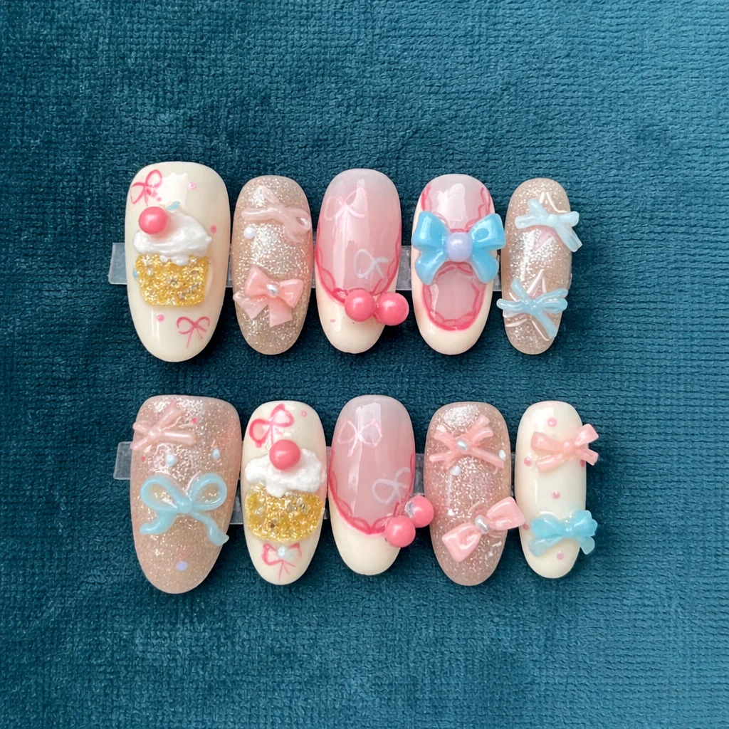 If you’re looking for cute pastel press on nails with cupcake and bow details, this set is designed to stand out.
