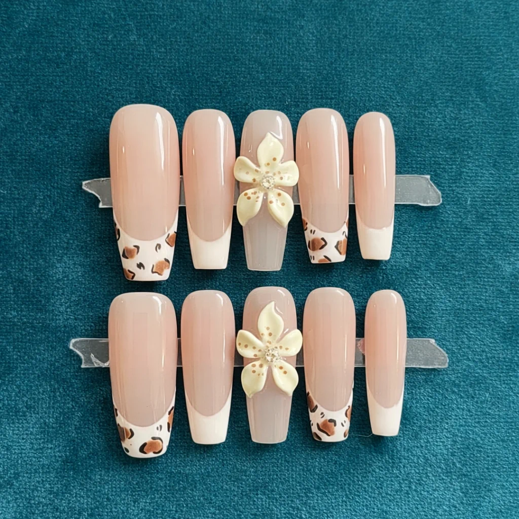 Chic nude press-on nails featuring leopard French tips and a delicate 3D floral accent. Designed for effortless everyday elegance with a statement finish.