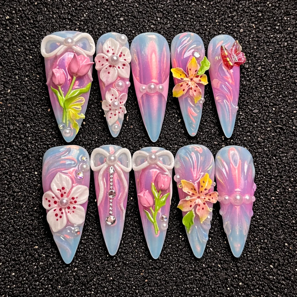 This enchanting set features iridescent pink and blue gradient tones, creating a luminous base that shifts beautifully under light. The nails are decorated with intricate 3D floral sculptures, delicate bow accents, and elegant pearl details, adding depth and femininity to the design.