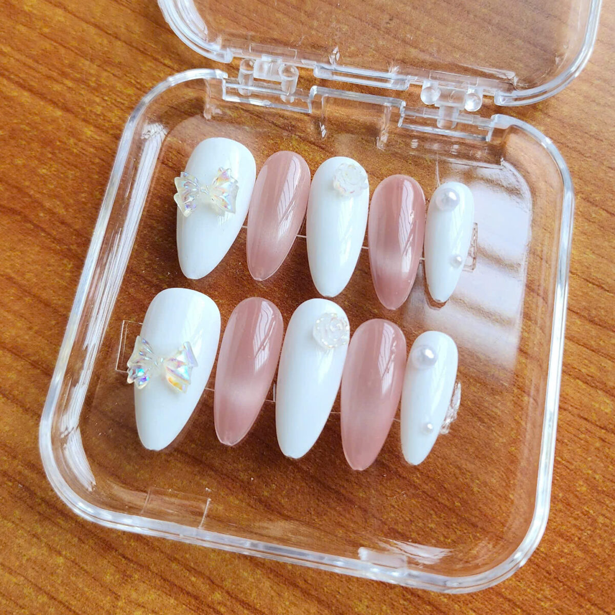 • Design: Alternating solid milky white nails with dusty rose cat eye. Includes stunning iridescent 3D butterfly/bow charms, delicate white roses, and pearl clusters.