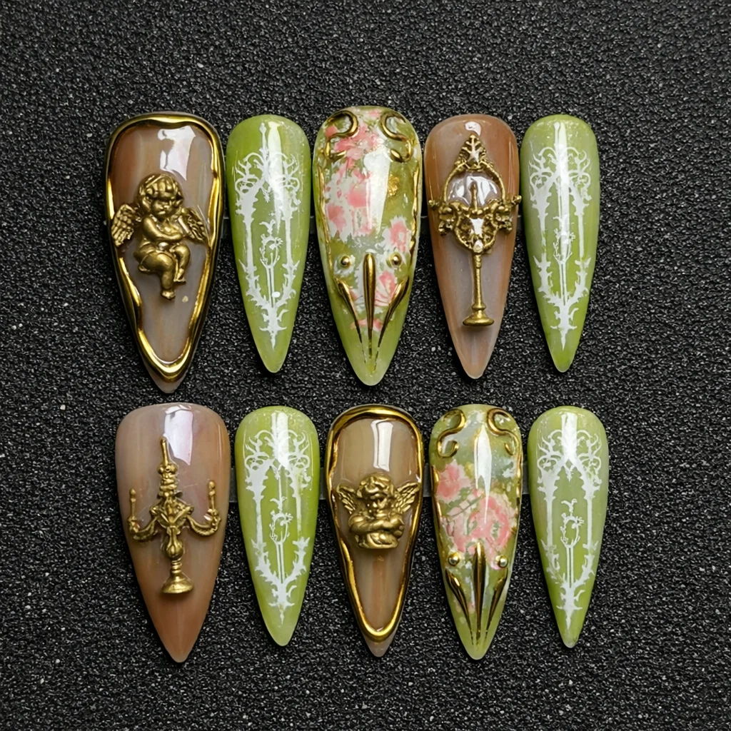 Step into timeless elegance with these Vintage Cherub Floral Luxury Press On Nails, a design inspired by classic European art and baroque aesthetics.